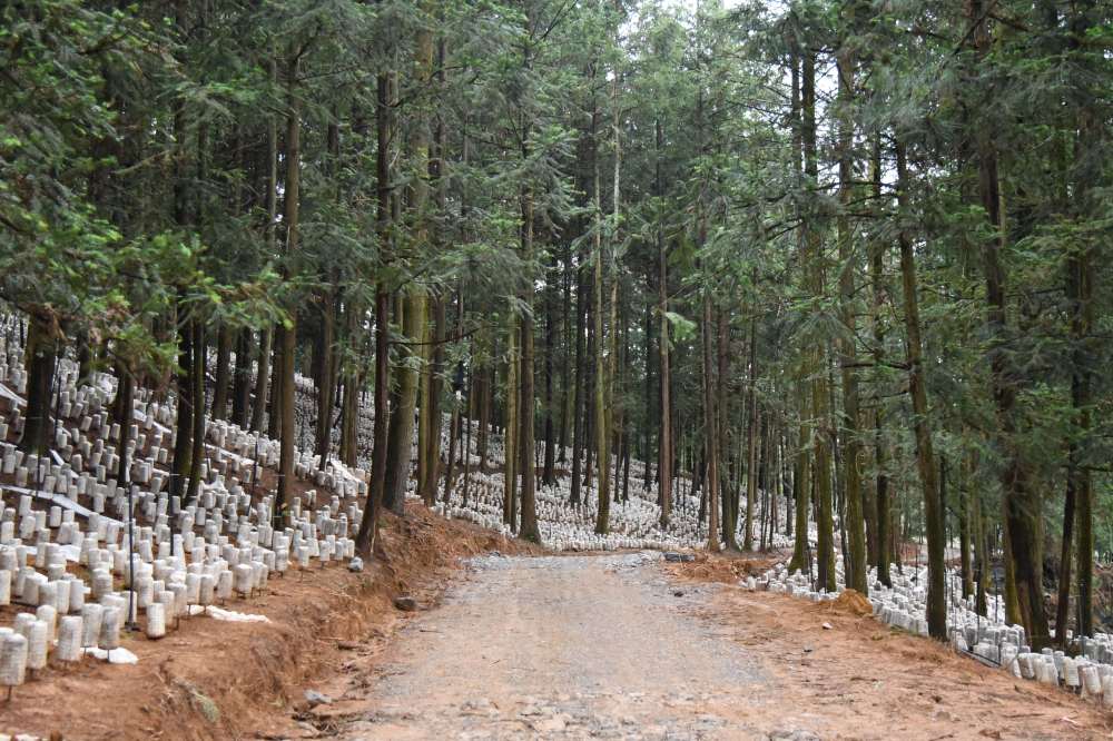 在黔西南州兴仁市真武山街道林下菌药种植基地,整整齐齐的菌棒摆满树林。新华社记者 施钱贵 摄