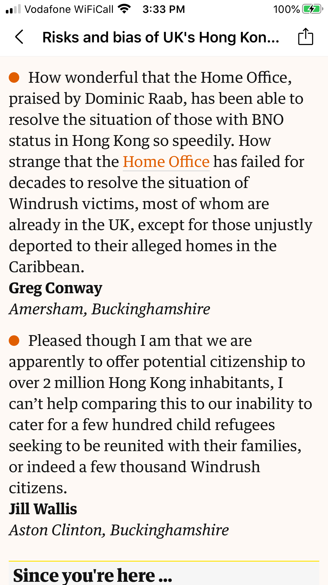 “多‘美妙’啊,内政部得到了多米尼克·拉布的称赞,能如此迅速地解决香港具有BNO身份者的处境。多奇怪啊,内政部数十年来都未能解决‘疾风一代’受害者的处境,而且他们其中大多数人已经在英国,除了那些被不公正地驱逐回所谓‘加勒比海家园’的人。”