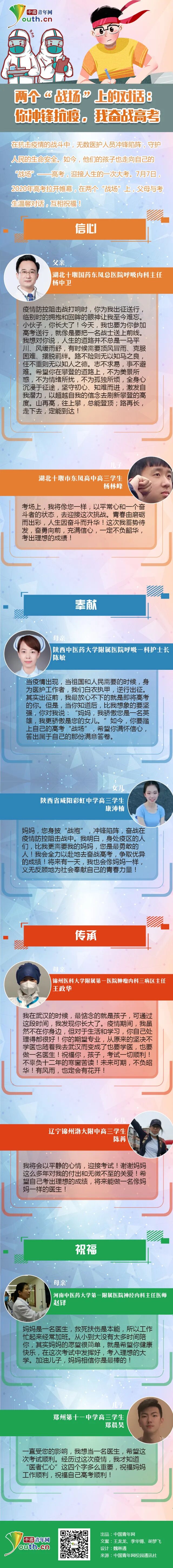 在抗击疫情的战斗中,无数医护人员冲锋陷阵,守护人民的生命安全。如今,他们的孩子也走向自己的“战场”——高考,迎接人生的一次大考。7月7日,2020年高考拉开帷幕,在两个“战场”上,父母与考生温馨对话,互相祝福!