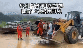 7月6日上午,由于持续暴雨,杭州临安天目溪水短时间涨至路面,漫进民居。因短时间的水位暴涨,於潜镇祈祥村仍有3处共14人被困水中,需要转移。由于水位较深,最深处有半人高,普通车辆、消防车都没法涉水救援。为了尽快救援,消防员用挖掘机救人。