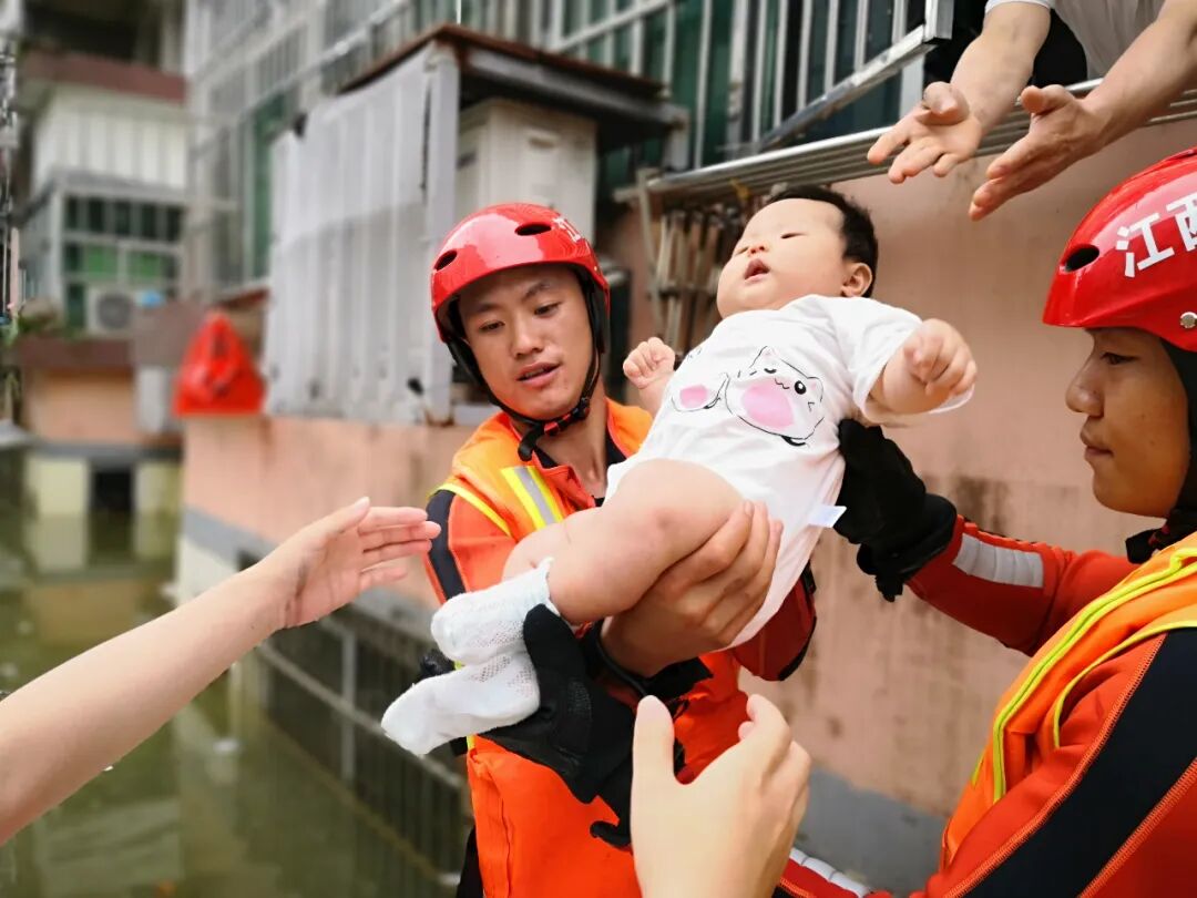 7月9日15时许,由于连日持续强降雨,江西省景德镇市多地发生洪涝灾害,景德镇市昌江区消防救援大队接到报警称:茶山路金叶小区一位母亲带着7个月大的婴儿,被洪水困在家中3天,家中已“弹尽粮绝”。消防员得知情况后,立即赶赴现场,使用皮筏艇到达母子二人被困地点,从二楼窗户口先将孩子抱出。转移过程中,孩子露出惊讶的神情。看到这一幕,有网友模仿孩子的口吻评论道:“娃娃:这么多手都伸向我,我感觉自己惊住了。”