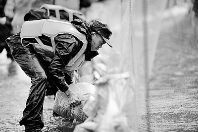 7月10日,武警江西省总队南昌支队官兵冒雨为新建区大塘坪乡新培村村民的鱼塘构筑拦鱼坝。曹先训摄/光明图片