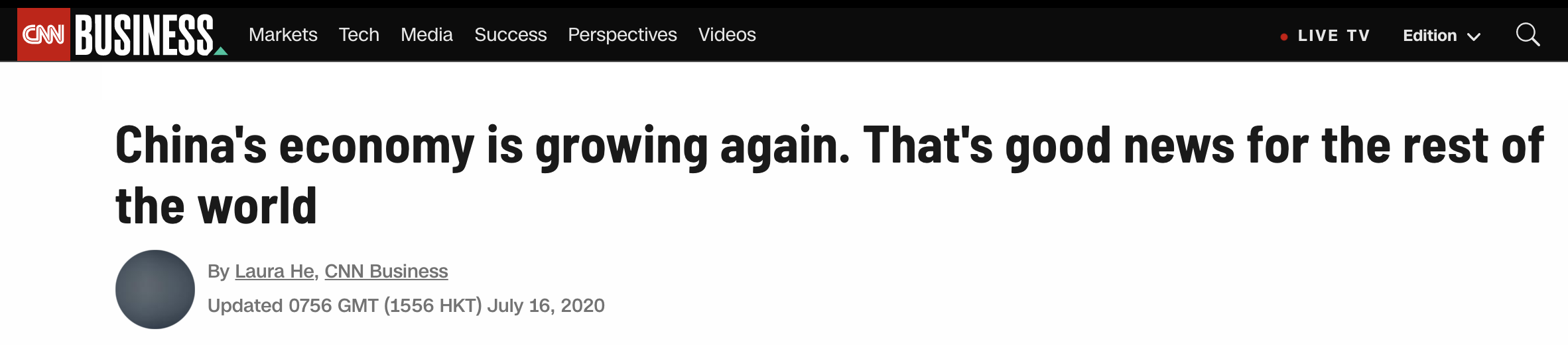 CNN认为,中国经济的复苏表明,虽然第一季度经济出现明显下滑,但今年中国经济仍将继续增长。英国智库牛津经济研究院称,中国经济在下半年继续增长“得益于成功遏制疫情后市场情绪的好转,以及显著放松的财政和货币政策”。