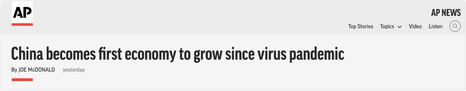 美联社16日评论称,中国成为自新冠肺炎疫情暴发以来第一个实现增长的主要经济体,在解除抗疫封锁、工厂和商店重新开业后,二季度经济意外强劲增长3.2%。
