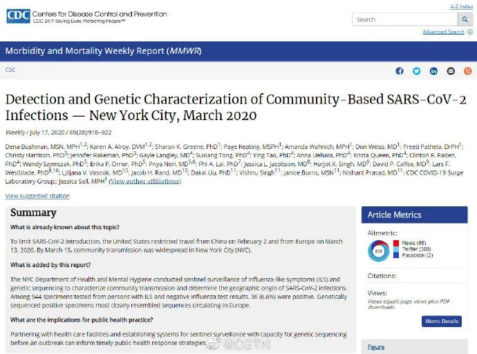美国疾病控制与预防中心17日发布报告说,特朗普总统早在2月2日就匆忙发布对中国游客的入境禁令,可直到3月13日才宣布对欧洲国家实行入境限制,但在3月8日,新冠病毒早就开始在纽约市的社区传播。