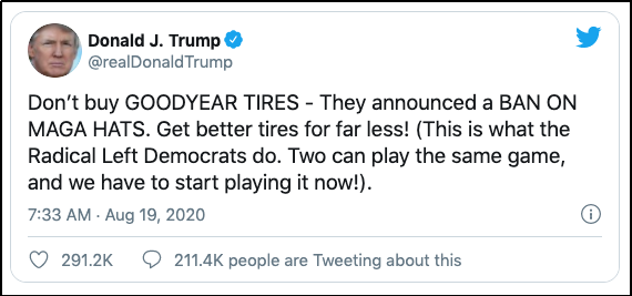 特朗普对固特异公司的批评推文当天一大早七点半就发出了。他写道:“不要买固特异轮胎了,他们发布禁止佩戴MAGA帽子的指令。大家去买更便宜更好的轮胎吧!(这种事是激进左翼民主党才会干的。既然这是双方都能玩的游戏,那我们现在就开始吧!)”之后, 特朗普在接受采访时表示,如果有别的选择,他会把他总统座驾的固特异轮胎换成其他品牌。