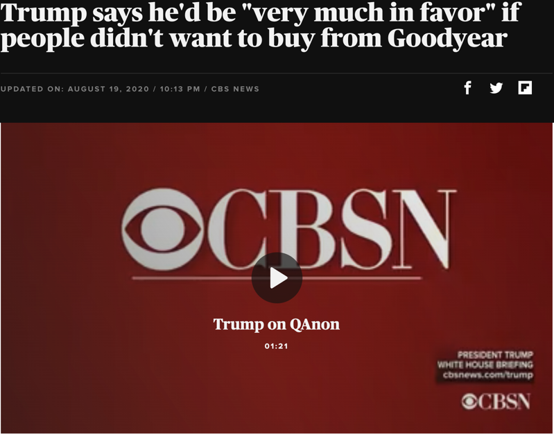 △美国哥伦比亚广播公司报道,特朗普号召支持者抵制固特异轮胎