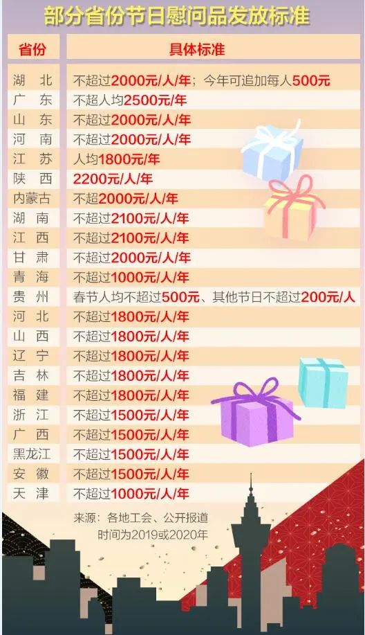比如,上海、湖北、内蒙古、山东、陕西、福建等省份不同程度上调了慰问品标准的上限。其中,陕西将基层工会慰问品标准上限提高700元,至每人每年不超过2200元。
