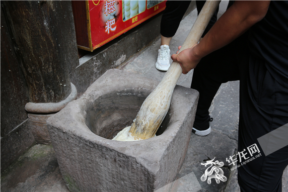 记者团在安居古城体验打糍粑。华龙网-新重庆客户端记者 张馨月 摄