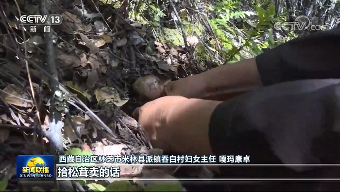西藏自治区林芝市米林县派镇吞白村妇女主任 嘎玛康卓:拾松茸卖的话,一天是2000元,3000元,最少也是600元一天。
