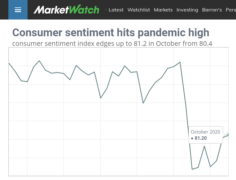 当地时间10月16日,美国密歇根大学发布数据显示,美国10月消费者信心指数初值从上月的80.4微升至81.2,仍远不及疫情暴发前的水平,复苏之路还很漫长。与此同时,10月消费者现况指数初值降至84.9,低于9月的87.8,表明消费者对当前的经济状况并不乐观,这与疫情控制不力以及纾困措施难产有关。