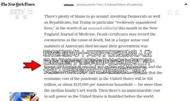 评论指出,现在美国每十天死于新冠肺炎的人数已经相当于美军在伊拉克和阿富汗长达19年战争中士兵的死亡总数,并且有美国经济学家预计,新冠肺炎疫情给美国造成的经济损失将达16万亿,也就是每个美国家庭承受约12.5万美元的损失。