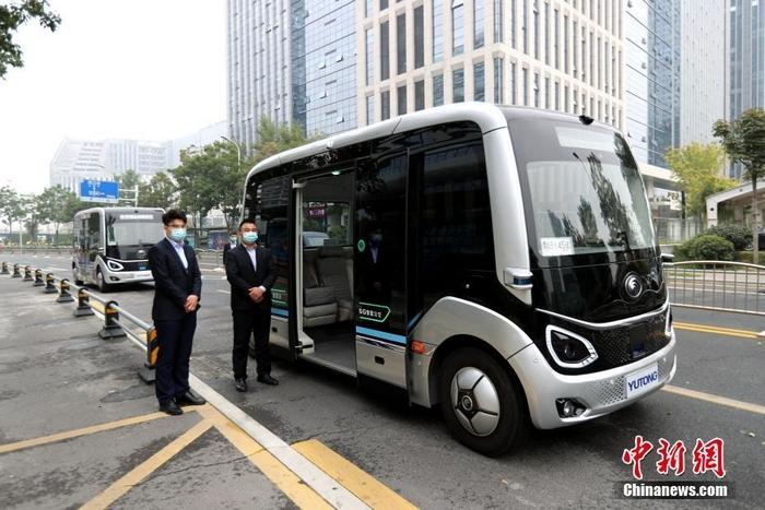 10月27日,郑州郑东新区智慧岛街头的无人驾驶巴士。 中新社记者 王中举 摄