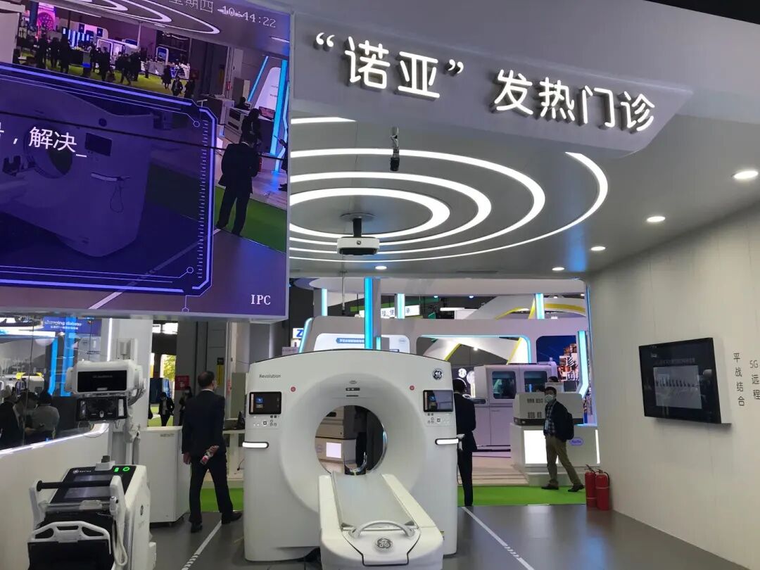 进博会三届老友GE公司的展品同样令人耳目一新。在GE展台,“诺亚发热门诊解决方案”展区还展出一台雷神山医院同款CT,在CT的上部,有一个“深度天眼”的装置,可以通过人工智能自动定位系统,识别人体扫描部位,满足5G场景下实时应用,单个患者的扫描时间节省30%。“这套系统可以根据医疗机构的环境,减少医患接触,或者也可以做成方舱医院的形式整体输出使用,满足疫情暴发期、疫情常态化防控期等不同公共卫生防疫时期的多模态需求。”工作人员介绍。