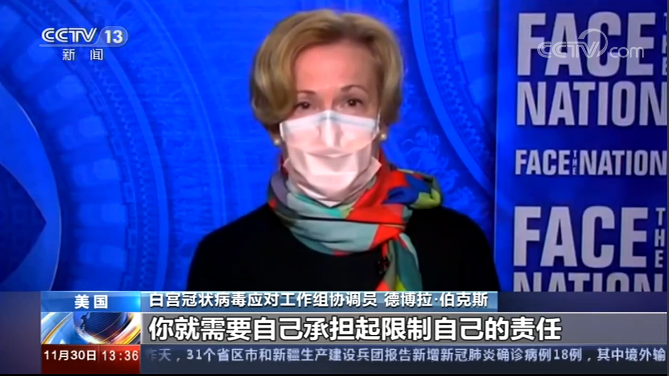 德博拉·伯克斯 :“对于每一个美国人来说,这是保护自己和家人的时刻。所以,如果你的州长或者市长没有实施我们所知的关键措施,包括要求戴口罩、保持社交距离、别去酒吧和拥挤的室内场所。如果这些限制措施在你的州不存在,你就需要自己承担起限制自己的责任。”