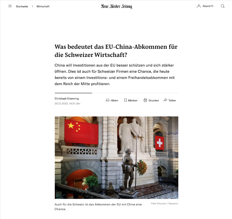瑞士最大的报纸《新苏黎世报》评论说,瑞士企业不用担心作为非欧盟国家会吃亏,反而瑞士还能受益。因为如果欧盟公司增加对华投资,也将间接提振瑞士出口商的生意,比如德国汽车业就有许多供应商是瑞士企业。
