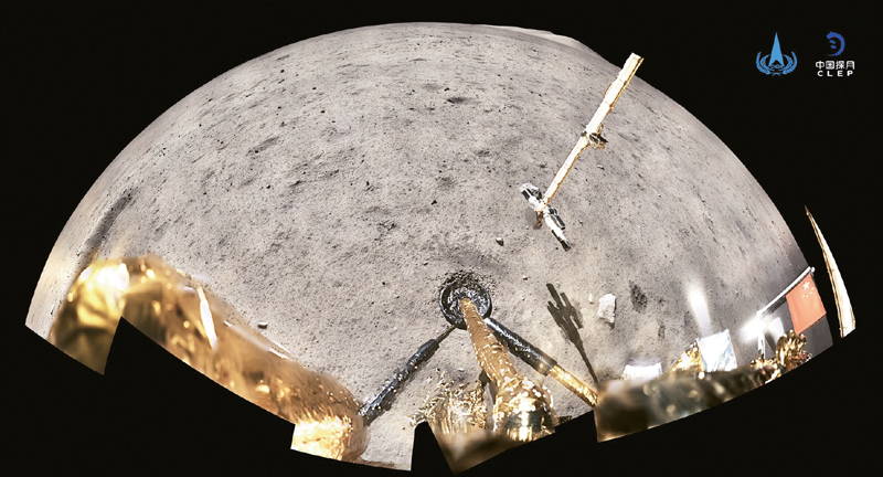 2020年12月4日,国家航天局公布了探月工程嫦娥五号探测器在月球表面国旗展示的照片。嫦娥五号着陆器和上升器组合体全景相机环拍成像,五星红旗在月面成功展开,此外图像上方可见已完成表取采样的机械臂及采样器。 新华社发(国家航天局供图)