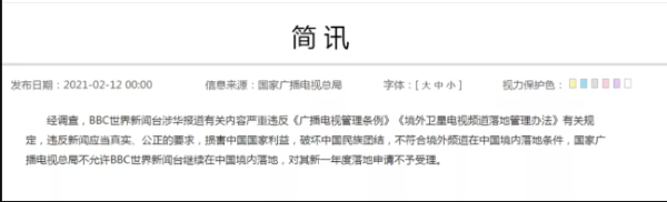 大年初一凌晨,广电总局官网发布消息,BBC世界新闻台涉华报道有关内容严重违反《广播电视管理条例》《境外卫星电视频道落地管理办法》有关规定,违反新闻应当真实、公正的要求,损害中国国家利益,破坏中国民族团结,不符合境外频道在中国境内落地条件,国家广播电视总局不允许BBC世界新闻台继续在中国境内落地,对其新一年度落地申请不予受理。