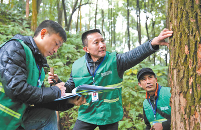 四川省宜宾市翠屏山人造城市森林公园绿化覆盖面积达160公顷,图为护林工在记录树木的情况。 庄歌尔摄(人民视觉)