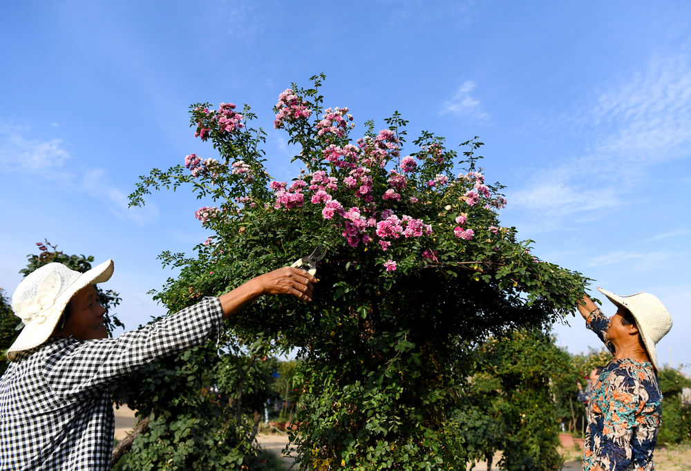 ↑2020年5月28日,村民在南阳市宛城区瓦店镇古桩月季园劳作。
