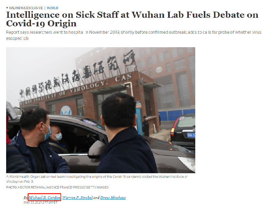 Screenshot of WSJ exclusive report “Intelligence on Sick Staff at Wuhan Lab Fuels Debate on Covid-19 Origin” published on May 23, 2021