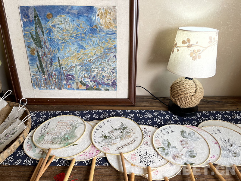 如何“写乡愁”?张胜迪选择从一张纸上做文章。这种古法纸需要经过取材、蒸煮、漂洗、打浆、揭纸等十二道主要工序,历时49天,全过程纯天然、纯手工。以古法造纸技艺为基础,张胜迪的团队利用花茂村的山川、河流、村庄、大地、民居等元素,创作出独具特色的纸浆压花画,在传承和发扬非物质文化遗产的同时,打造乡愁文化。如今,花茂人家已经开发出台灯、绘本、手账、扇子、明信片、油纸伞等文创产品。