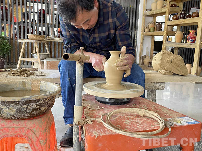 花茂村的土陶制作有着140多年的历史,53岁的母先才是家族制陶的第四代传人,也是土陶非遗文化传承人。在母先才的陶艺体验馆里,摆放着各种成品,供游客观摩、选购,还有数十台拉坯机,供游客或学徒们使用。