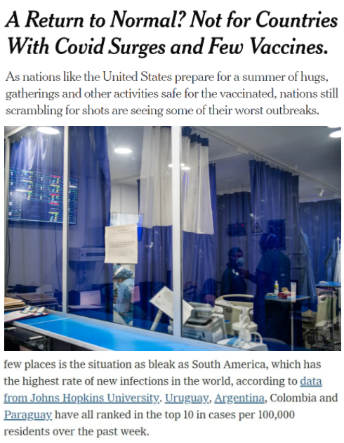 再看南美地区。《纽约时报》报道指出,南美洲的新冠病毒感染率目前是世界上最高的。但在美国等富裕国家准备回归常态之际,较贫穷的国家却因为缺少疫苗而不得不面临新冠病毒大流行以来最严峻疫情的考验。
