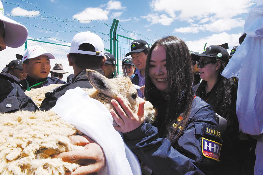 第一只放归的藏羚羊是4年前救助的那只,工作人员将酥油抹在藏羚羊的羊角和额头上,参加活动的嘉宾和爱心人士将洁白的哈达挂在藏羚羊脖子上,将祝福毫无保留地送给即将回归大自然的藏羚羊。