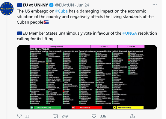 因此,联合国184个国家才会在在今年6月23日的联合国大会上,投票通过了要求美国解除对古巴禁运及制裁的决议,当时,就连欧盟国家也一致投了支持票,可见美国的行为已经引起了国际社会多么强烈的反感。(注1:两个投反对票的国家是美国和以色列)(注2:当时美国媒体并没有给这个对美国不利的决议投入多少关注,反而是在集中力量抹黑中国的香港和新疆政策,以此转移矛盾和话题)