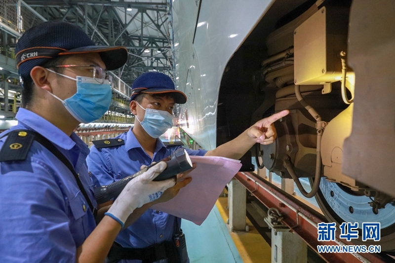 郑大维和彭昆对动车组进行检修。朱柯宇 摄