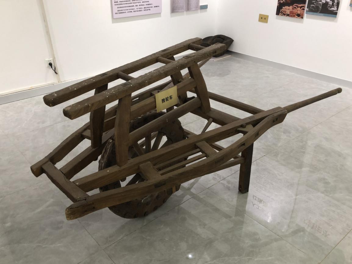 乌审旗水生态文明教育展示厅里摆放的当年建造巴图湾水库时使用过的独轮车。中国日报网记者 万月英摄
