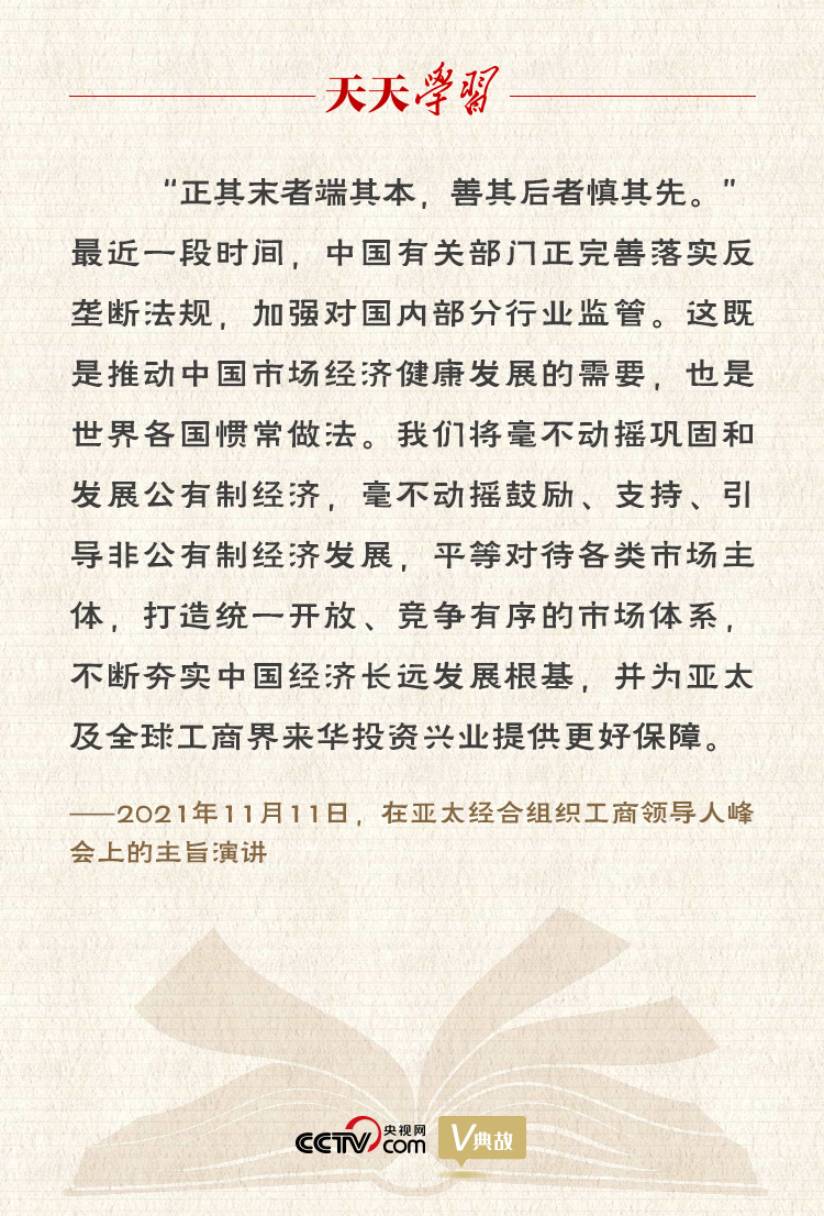 11月11日,习近平主席应邀在北京以视频方式向亚太经合组织工商领导人峰会发表题为《坚持可持续发展 共建亚太命运共同体》的主旨演讲。习近平指出,当前,新冠肺炎疫情仍在全球蔓延,世界经济复苏艰难曲折。亚太地区应该勇担时代责任,发挥引领作用,坚定朝着构建亚太命运共同体目标迈进。关于当前中国经济发展形势,习近平指出,最近一段时间,中国有关部门正完善落实反垄断法规,加强对国内部分行业监管。他引用“正其末者端其本,善其后者慎其先”,旨在强调上述举措是治本之策、先手之棋、破题之举。