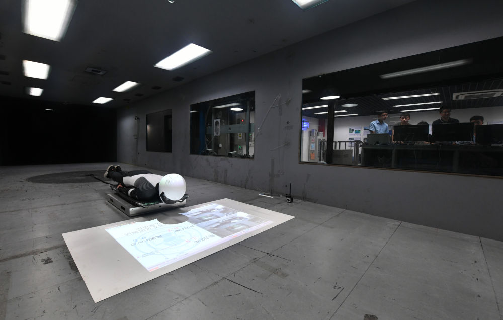 北京交通大学风洞实验室研究团队成员通过风洞辅助训练系统进行风洞测试。该系统能够应用于冰雪项目运动姿态优化、强化训练及高性能运动装备研发(2021年7月16日摄)。新华社记者 任超 摄