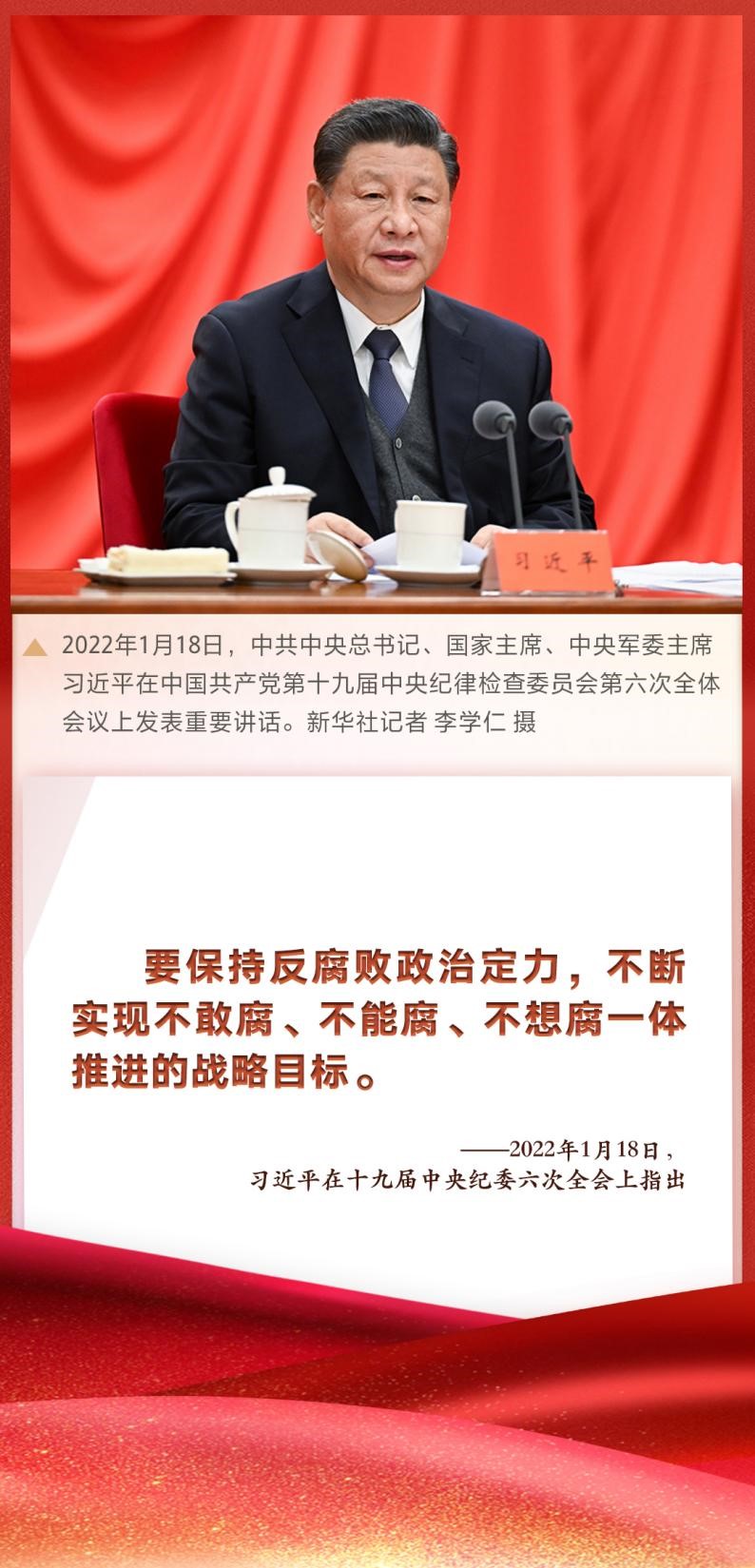“要保持反腐败政治定力,不断实现不敢腐、不能腐、不想腐一体推进的战略目标。”中共中央总书记、国家主席、中央军委主席习近平在十九届中央纪委六次全会上发表重要讲话,深刻总结新时代党的自我革命的成功实践,深刻阐述全面从严治党取得的历史性、开创性成就,产生的全方位、深层次影响,对坚持不懈把全面从严治党向纵深推进、迎接党的二十大胜利召开作出战略部署。