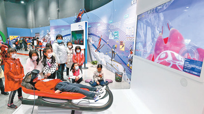 北京冬奥会和冬残奥会期间,在中国科技馆举行的冬梦飞扬——“科技冬奥”主题展览通过新技术手段,向参观者介绍科技冬奥的创新魅力。图为小朋友通过VR(虚拟现实)设备体验雪橇运动。 陈晓根摄(影像中国) |