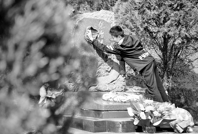 2021年4月4日,河南信阳,一位烈士后人在鄂豫皖苏区首府烈士陵园里擦拭墓碑。新华社发