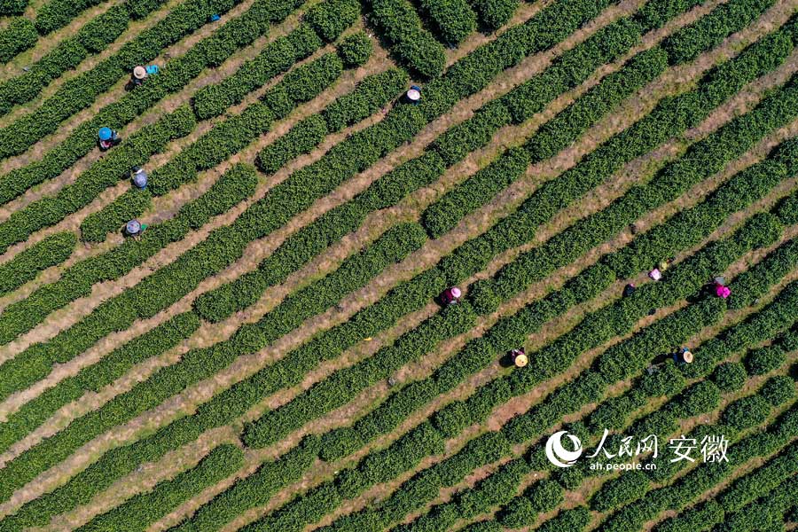人民网铜陵4月10日电 谷雨前,正值春茶大量上市的时节,连日来,随着气温回升,安徽省铜陵市义安区钟鸣镇茶农趁着晴好天气,抢抓农时,采摘春茶,供应市场。