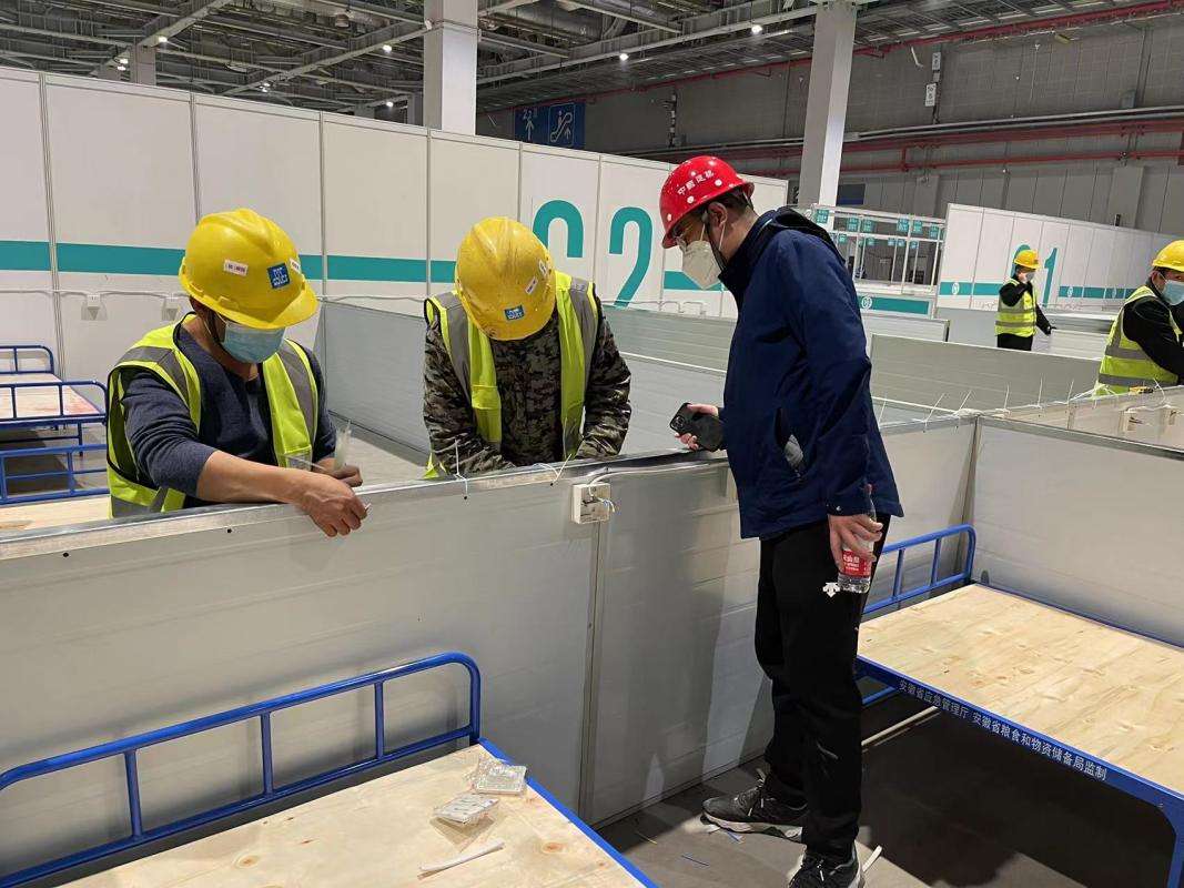 随手用冷水洗了把脸,刚刚从援建一线返回不足24小时的两人再度起航,一人开车,一人立马连夜开始联系人员、物资、车辆和后勤工作。不足1小时,参加过援建的20余名水电施工人员再赴国家会展中心方舱建设点。