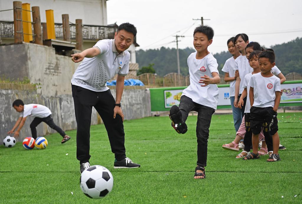 在江西省贵溪市金屯镇金屯村渡坊村小组,志愿者和留守儿童一起进行体育活动(2020年5月27日摄)。新华社记者 万象 摄