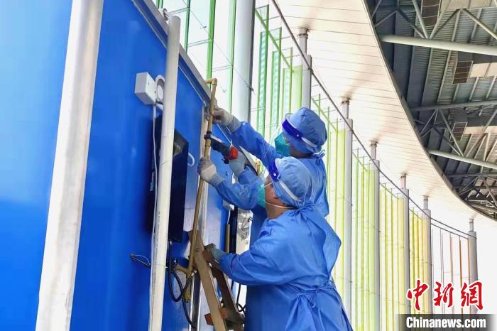 中建二局安装公司维保组人员维护方舱医院设施。 中建二局供图
