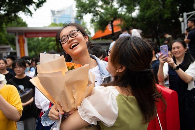 ↑6月9日,一名考生(左)在湖南省长沙市一中考点外从家长手中接过鲜花。新华社记者 陈思汗 摄