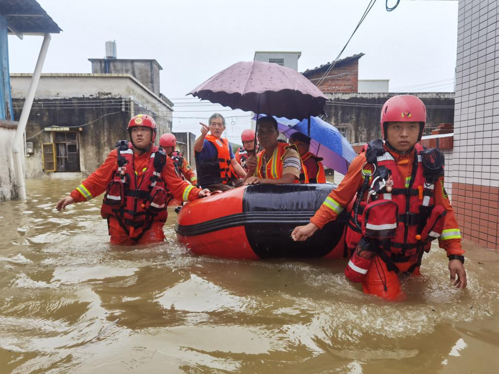 6月21日,在广东韶关市曲江区樟市镇铁厂村,消防救援人员转移被困群众。(新华社发 周思涛 摄)