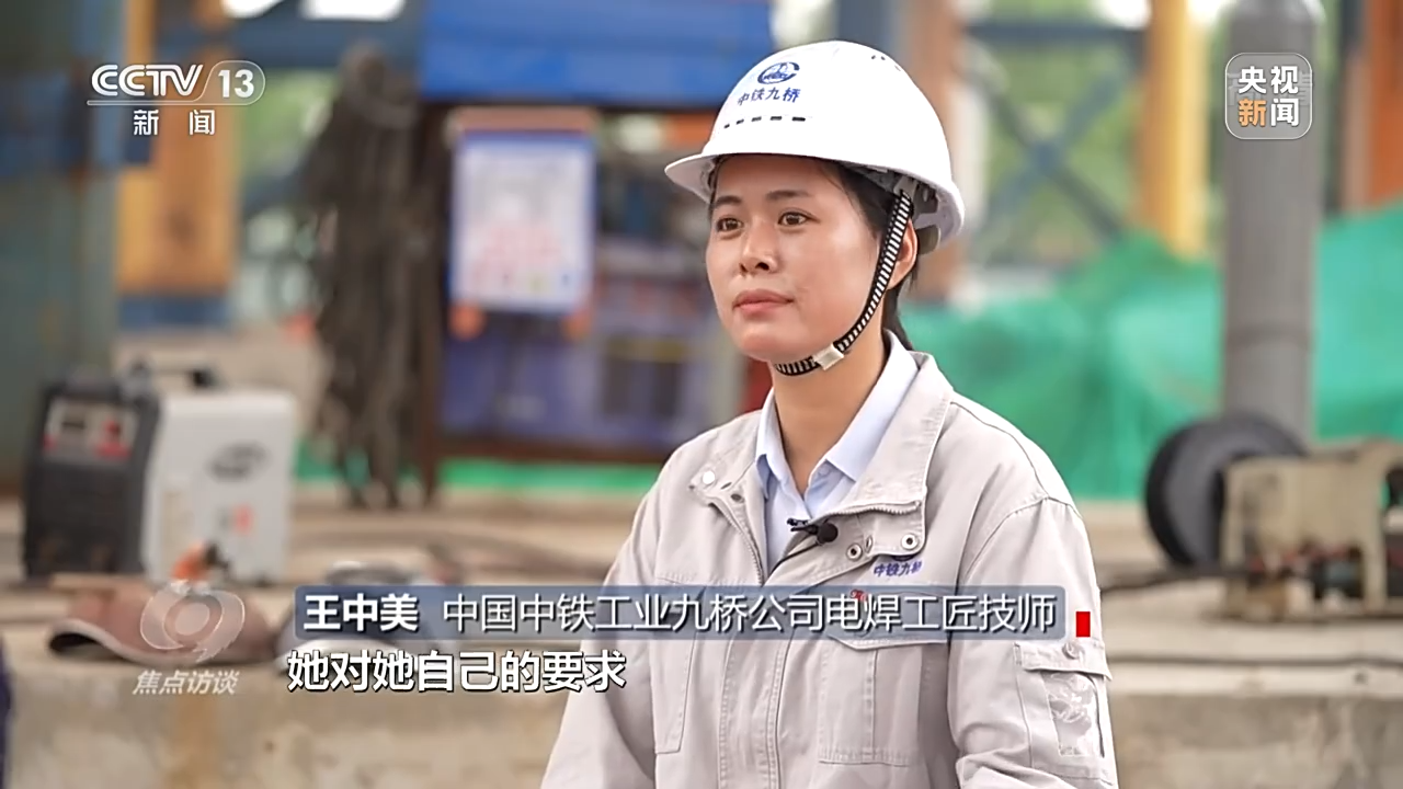 王中美是中铁工业九桥公司的焊工,刚被评为“大国工匠”。她的目标是确保自己焊接的每一道焊缝都经得起时间的检验。在全球最长悬索桥的施工现场,王中美曾主动尝试难度极高的一种焊接方式,经过专家探伤检测,她焊接的30多组高熔透焊缝一次性合格。