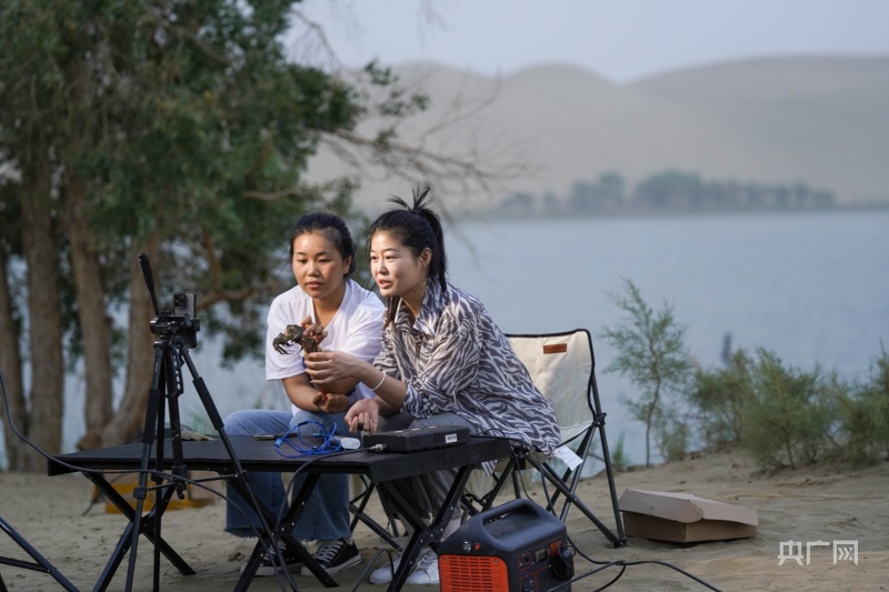 主播们正在罗布湖湖畔直播带货(央广网发 王雪 摄)