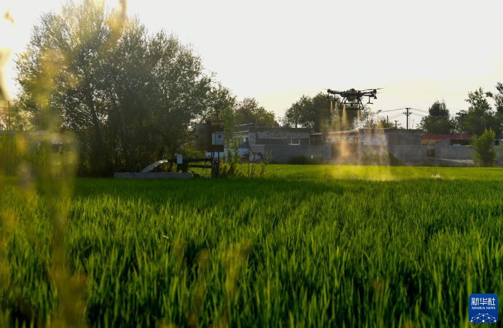 在位于乌鲁木齐市米东区三道坝镇杜家庄村的水稻田,植保无人机进行水稻病虫害防治喷洒作业(7月4日摄)。