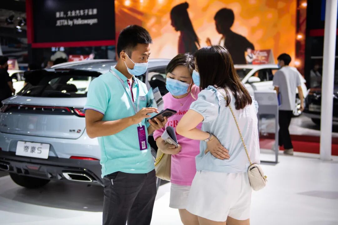 2022年7月13日,2022湖南汽车展览会暨长沙市汽车消费节在位于长沙的湖南国际会展中心举行。在湖南国际会展中心,工作人员(左一)向观众介绍产品。新华社记者陈思汗摄
