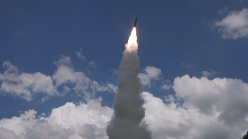 8月4日,东部战区火箭军对台岛东部外海预定海域实施火力突击。这是导弹升空。新华社发(洪治摄)