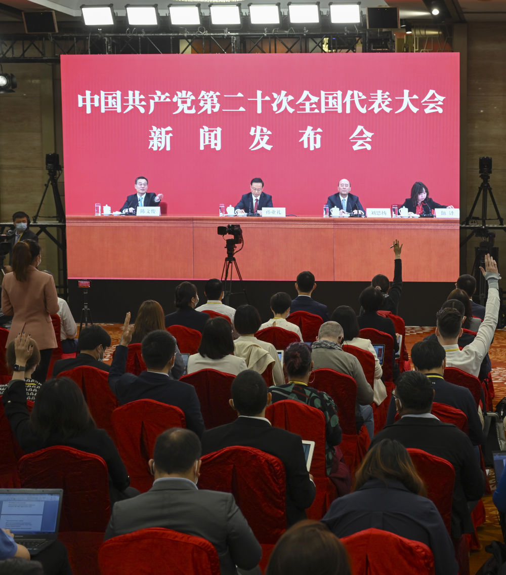 10月15日,中国共产党第二十次全国代表大会新闻发言人孙业礼在北京人民大会堂举行新闻发布会。这是记者在分会场举手提问。新华社记者 陈晔华 摄