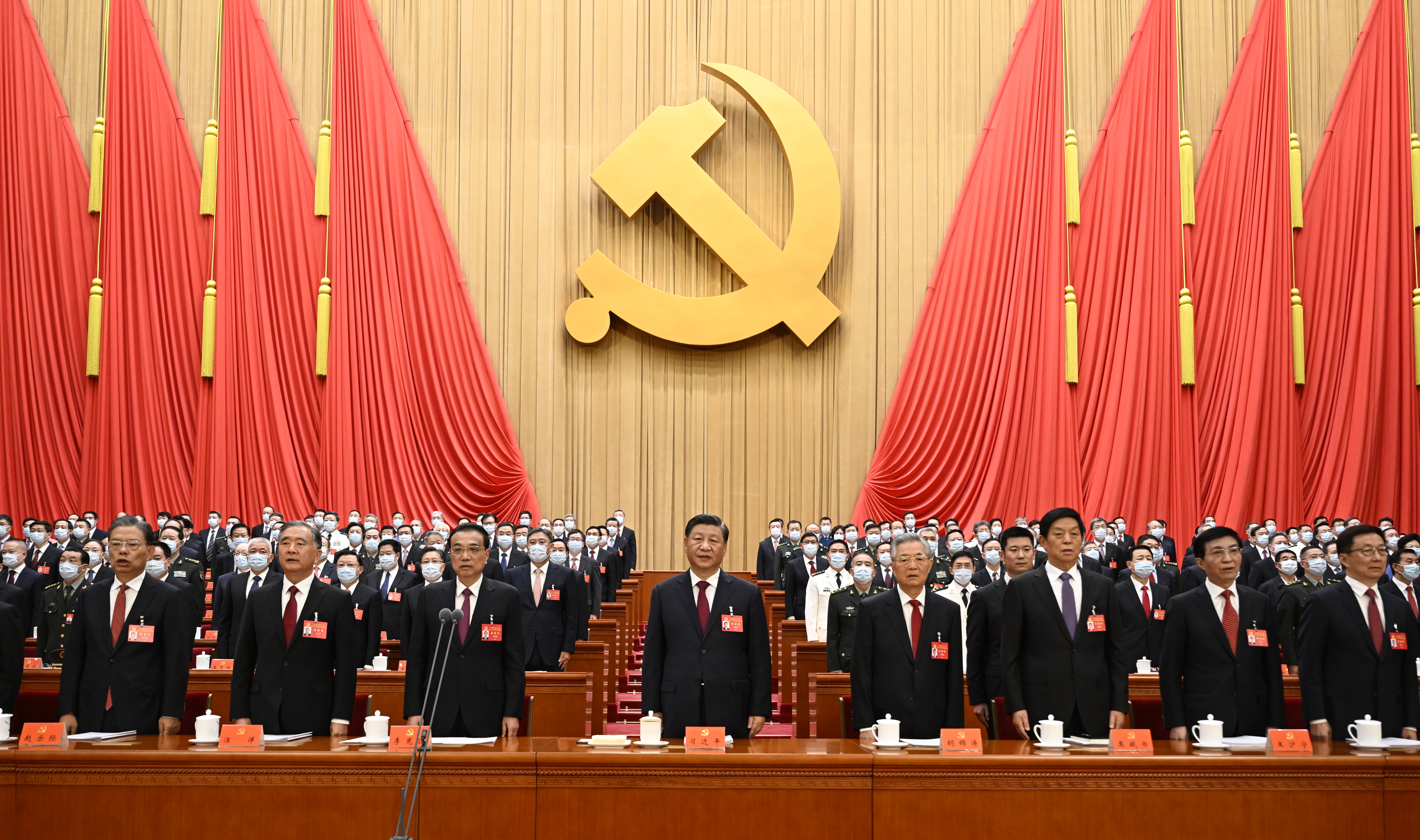 10月16日,中国共产党第二十次全国代表大会在北京人民大会堂开幕。这是习近平、李克强、栗战书、汪洋、王沪宁、赵乐际、韩正、胡锦涛在主席台上。新华社记者 李学仁 摄